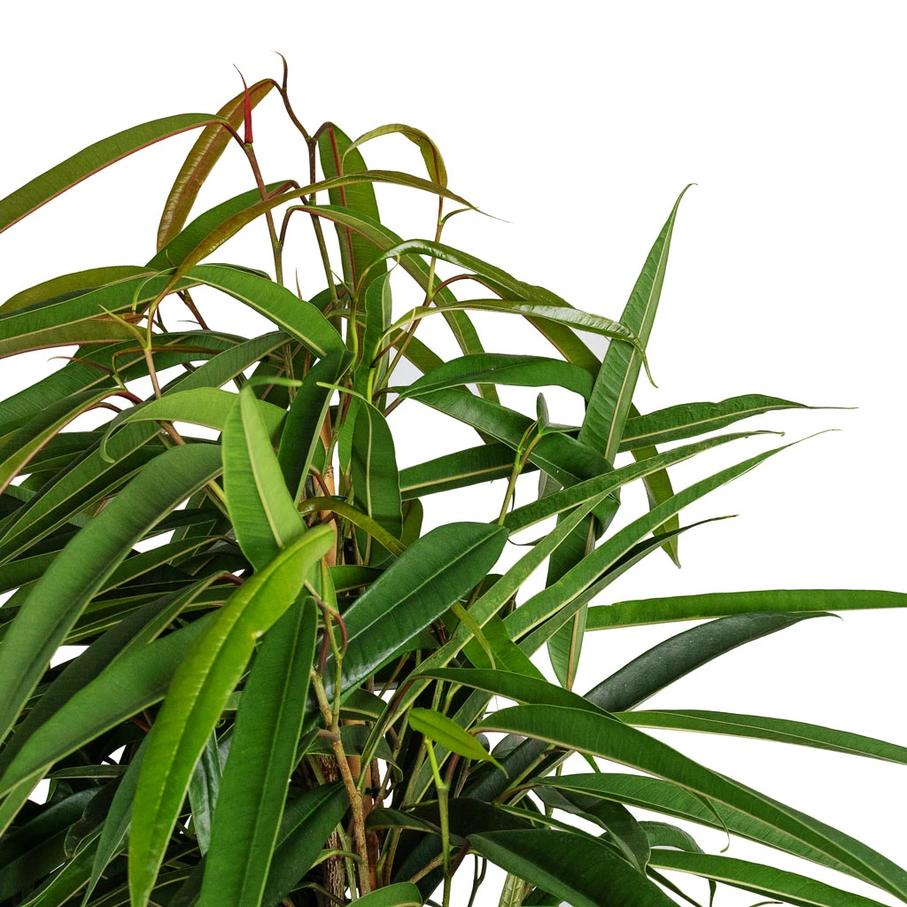 Ficus maclellandii Alii is a relatively new cultivar that makes a wonderful low-maintenance house plant. Alii has long, slender leaves that taper to a point (their other common name is Narrow Leafed Fig). With attractive, glossy leaves and graceful, arching stems that are almost palm-like in appearance, it is a versatile and attractive indoor green foliage option.