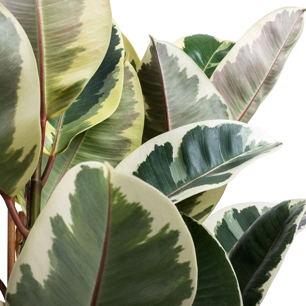 Standing proud, Ficus Tineke is a colourful and welcome addition to any living space. Its large tropical, waxy leaves boast a green and cream variegation all whist filtering the air.