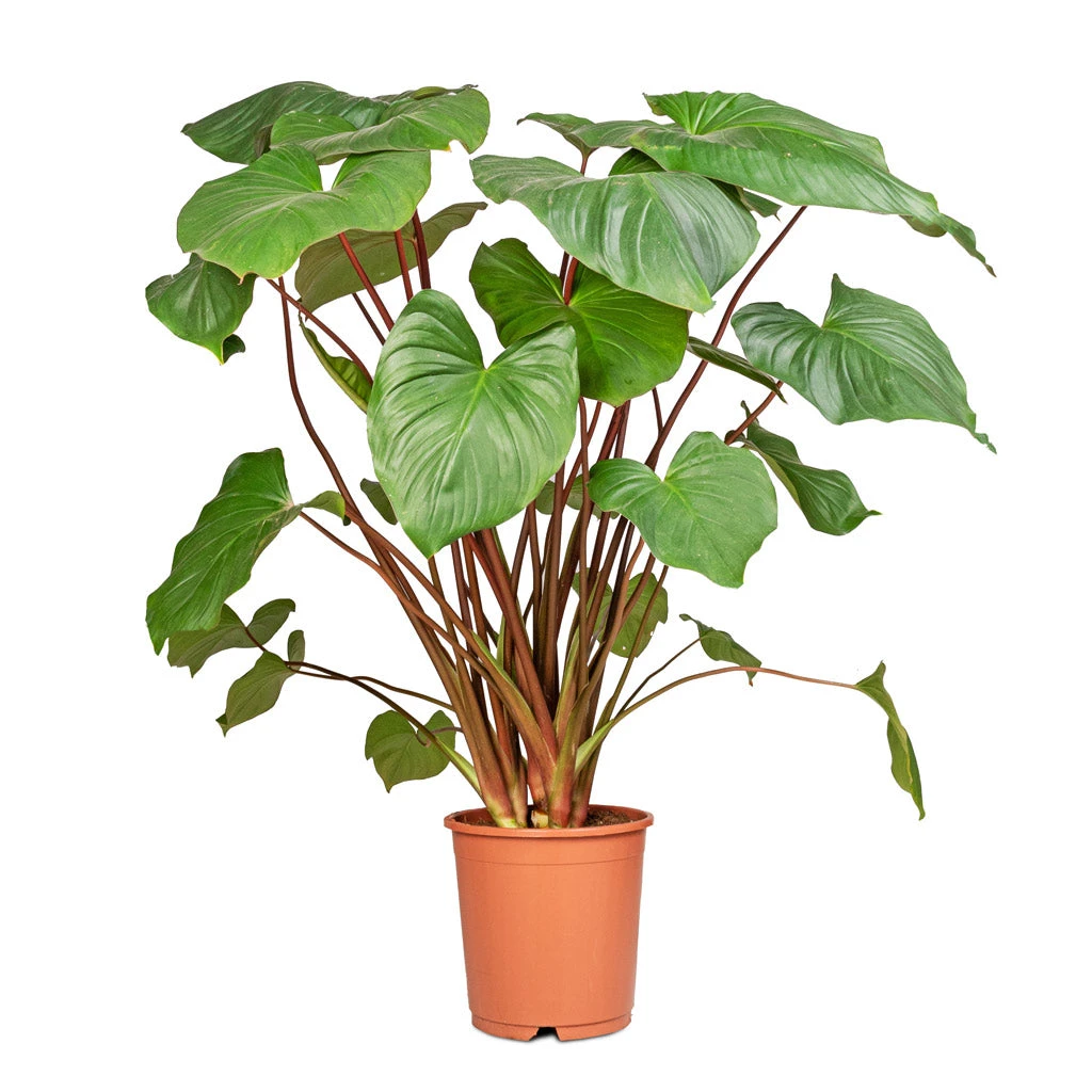 Known as the Shield Plant due to its large, heart-shaped leaves, this tropical triumph is a beauty to behold. Gliding on pinky-orange long arching slender stems, rippled lush foliage gives this plant a thick, full canopy reminiscent of exotic jungles in faraway lands. Reaching heights of up to 1.5 metres with a 1 metre spread, this plant packs a punch as a stand-alone statement, giving spaces an impressive point of interest.
