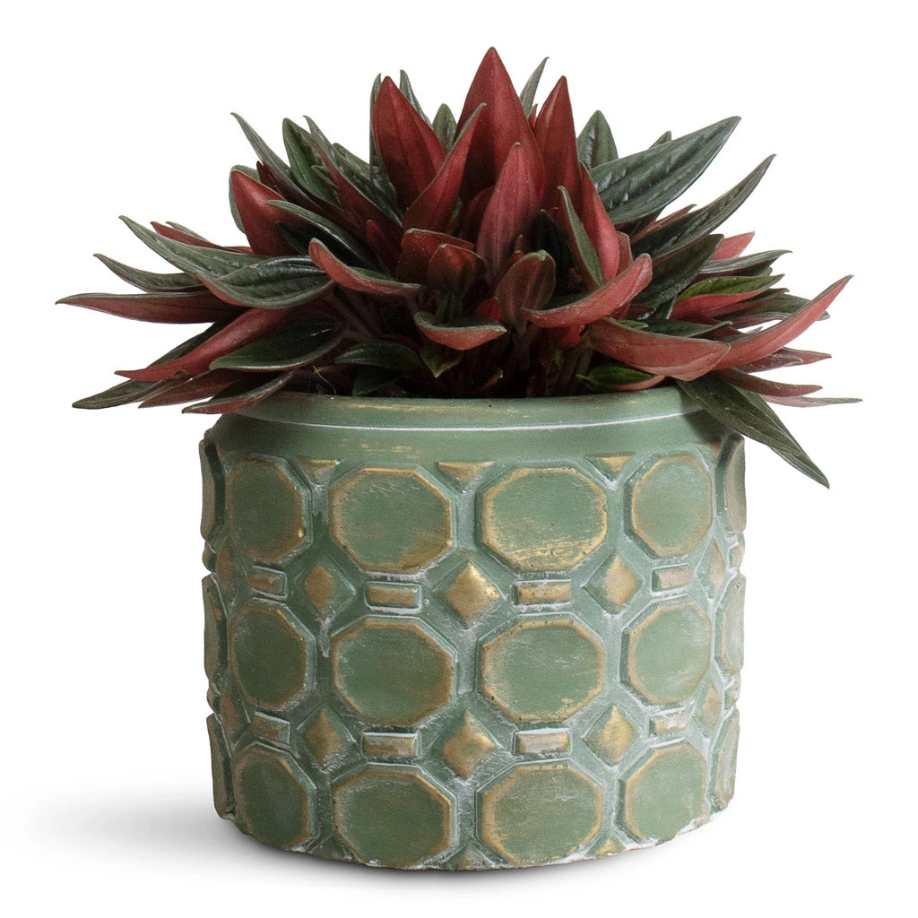 Vintage industrial vibes blend cylindrical pipework with chunky geometric shapes in a distressed verdigris finish. The Jurre plant pot adds rugged styling to harmonise with contemporary interiors.