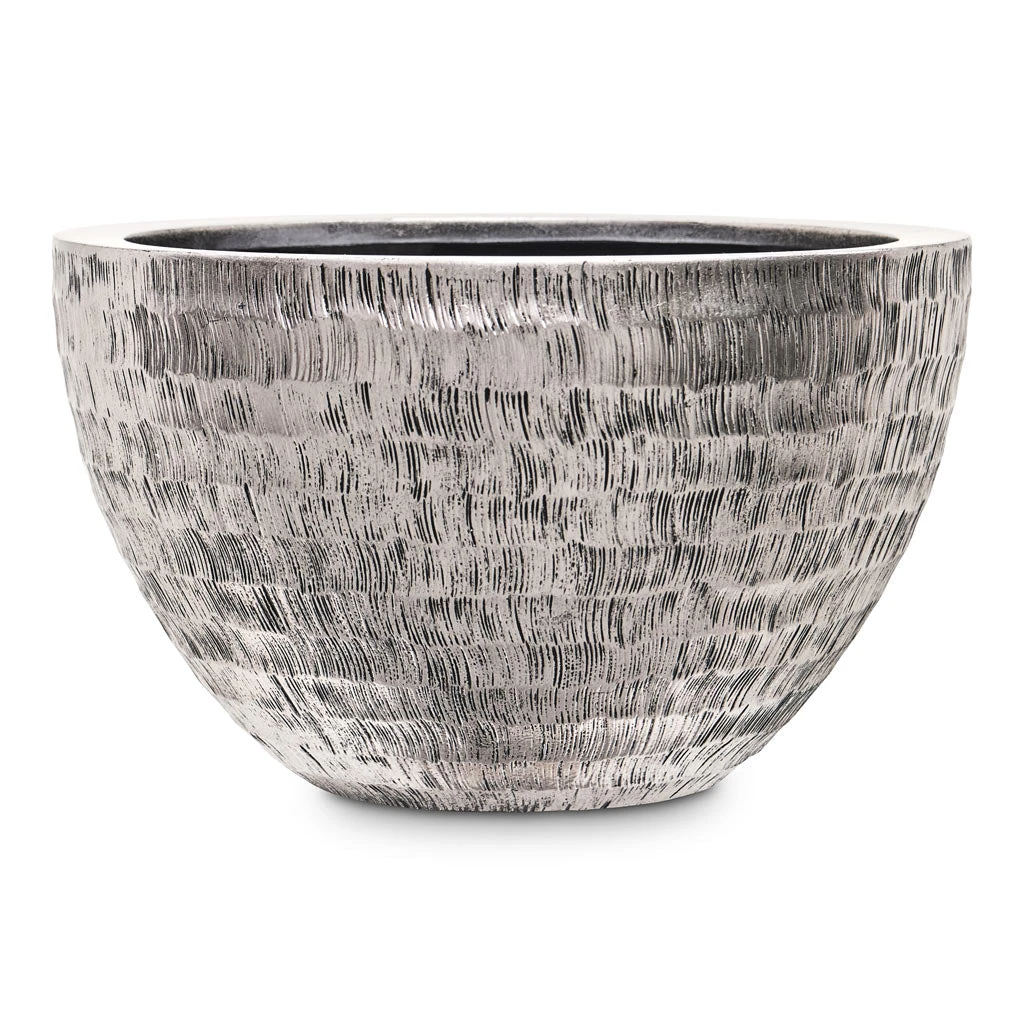 The Opus hammered bowl planter is handmade with a hemispherical design and an opulent brushed silver finish.