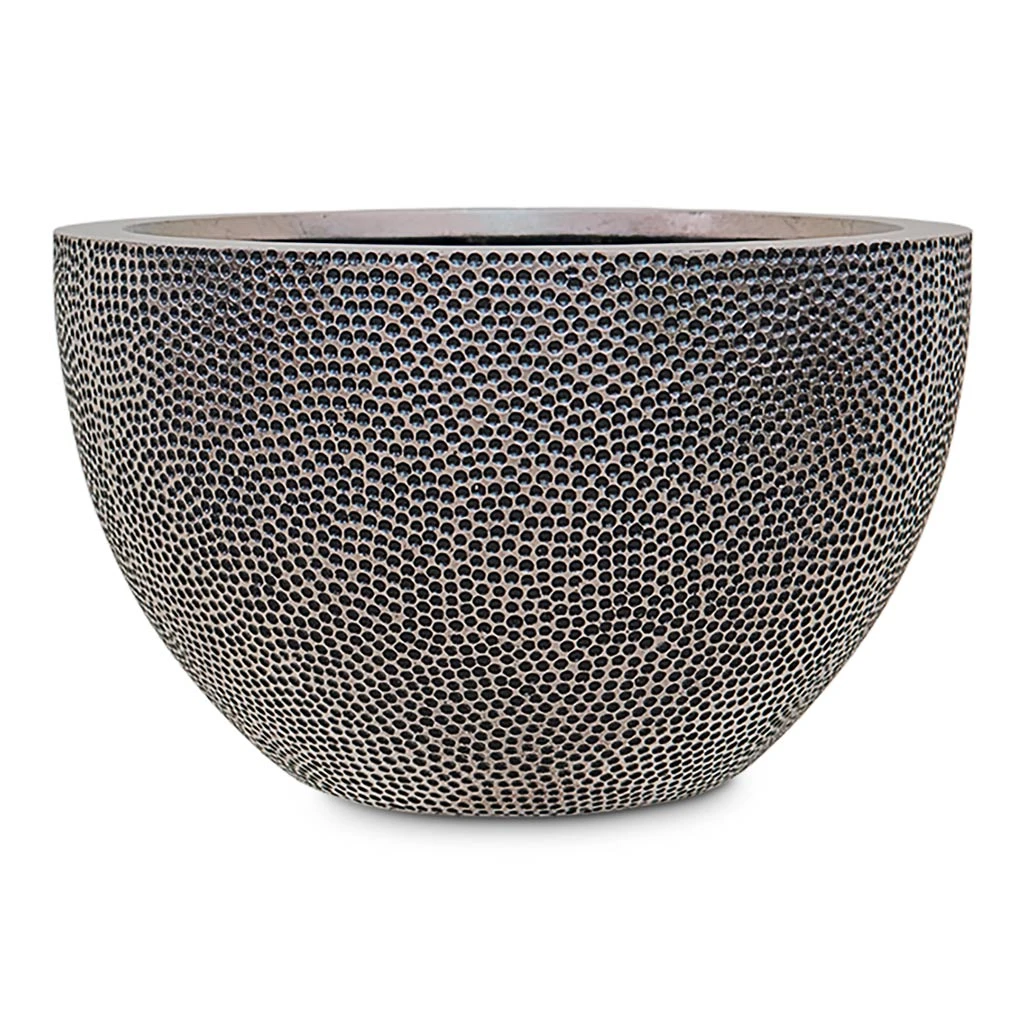 The Opus Hit bowl planter is handmade with a hemispherical design and a unique aerated molten metal styling in a lustrous silver finish. Perfect to showcase your vibrant greenery.