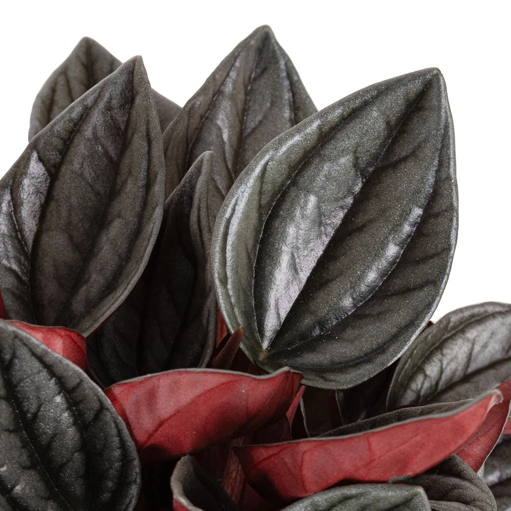 Peperomia Santorini boasts charming, round leaves in a lustrous green-grey hue with vibrant red undersides. Though muted, the colour palette is incredibly striking, offering an almost metallic sheen on top and sophisticated burgundy underneath. Each leaf also showcases the distinct ridges and ripples characteristic of the caperata variety, adding depth and allure to any shelf or tabletop.